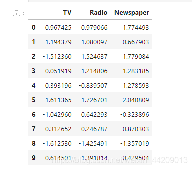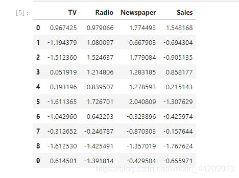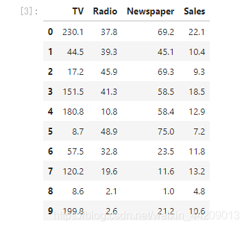 数据集共包含200条记录,特征值共有三个,分别是TV,Rodio,Newspaper。分别表示三个不同的广告投放路径。预测收益。