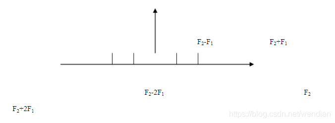 当上述的双音频测试信号作用于非线性器件时,在高音频周围就会产生边带分量群。高音频和第一对边带(二阶边带,F1±F2)之间,第二对边带(三阶边带,F1±2F2)与高频之间等,如图1所示。