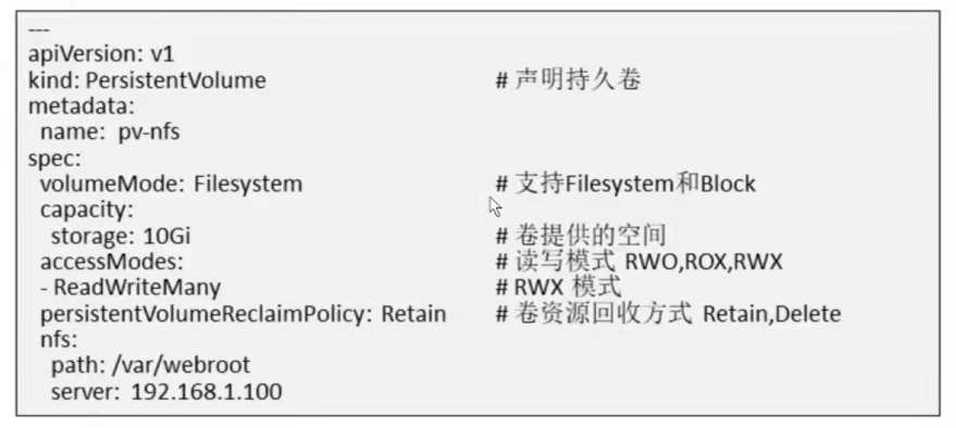 # 定义pv ~]# vim mypv.yaml --- kind: PersistentVolume apiVersion: v1 metadata: name: pv-nfs spec: volumeMode: Filesystem # 支持的模式文件夹 capacity: # 支持的空间 storage: 30Gi # 30G accessModes: # 支持的模式 - ReadWriteOnce # 单人模式(读写) - ReadOnlyMany # 多人只读 - ReadWriteMany # 多人读写 persistentVolumeReclaimPolicy: Retain # 数据回收方式(手工或自动) nfs: # 类型nfs server: 172.17.0.98 # 服务器ip path: /var/webroot # 文件 官网查看支持的模式持久卷 | Kubernetes ~]# kubectl apply -f mypv.yaml persistentvolume/pv-nfs created ~]# kubectl get pv NAME CAPACITY ACCESS MODES RECLAIM POLICY STATUS AGE pv-nfs 30Gi RWO,ROX,RWX Retain Available 3s
