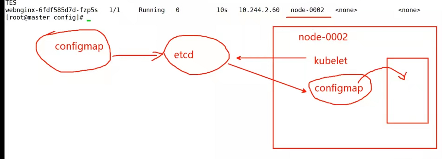 注:创建完configmap之后就会加入etcd数据库中,当kubelet收到要创建的configmap时就会从etcd中拿取,发到内存地址里,然后创建容器时会把configmap加入到容器内部,所以在任意节点加入容器都可以用