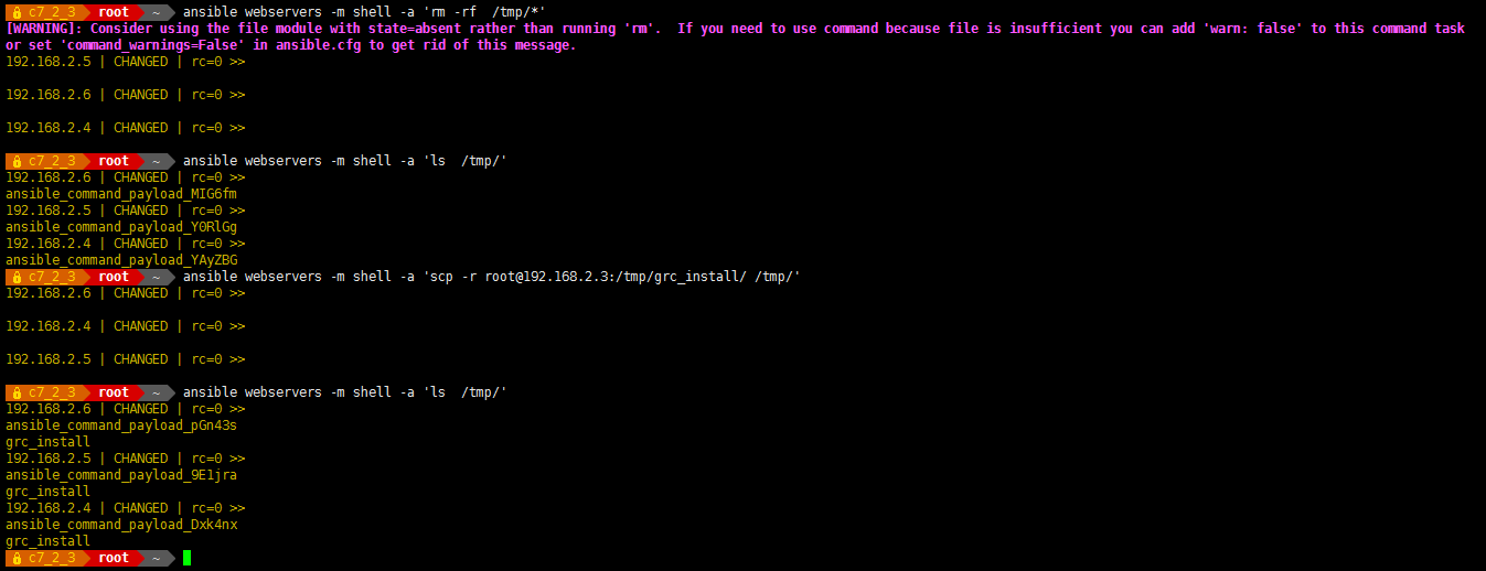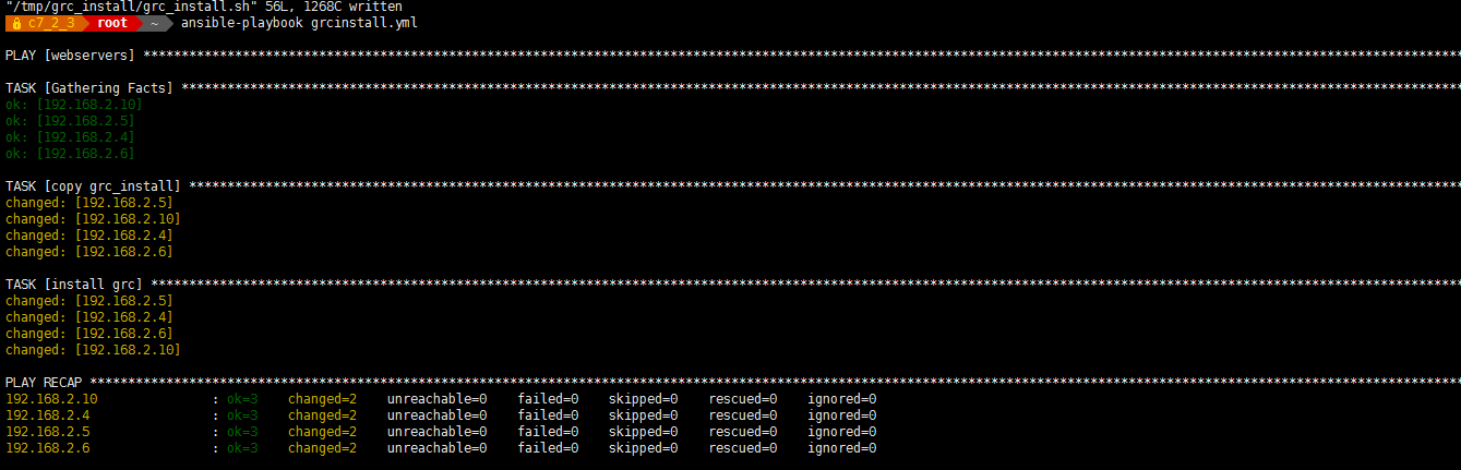 - ansible webservers -m shell -a '/usr/bin/bash /tmp/grc_install/grc_install.sh'