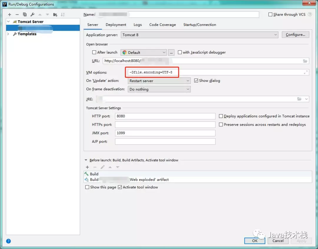 Edit Configurations > Tomcat Server > server > VM options > 设置为: