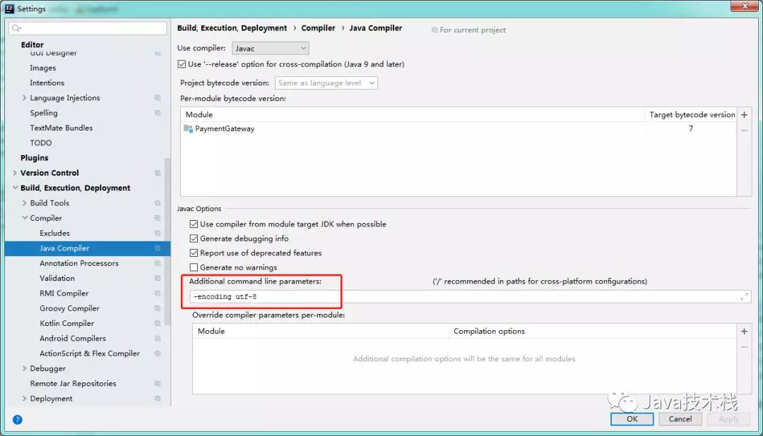 Settings > Build, Execution, Deployment > Compile > Java Compiler > Additional command line parameters > 设置为: