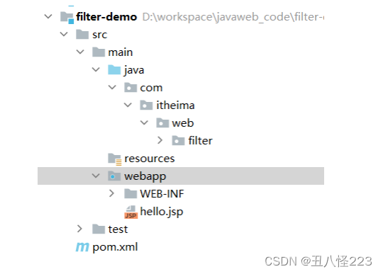 接下来编写过滤器。过滤器是 Web 三大组件之一,所以我们将 filter 创建在 com.itheima.web.filter 包下,起名为 FilterDemo