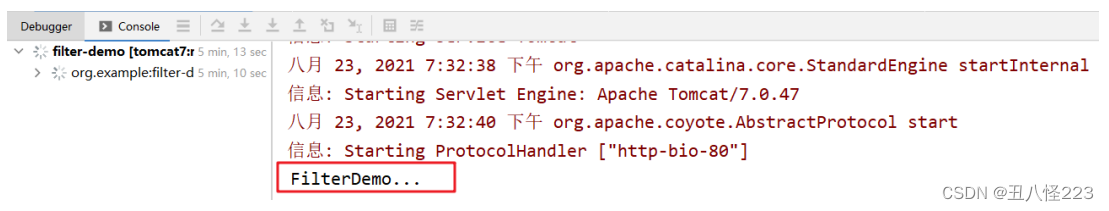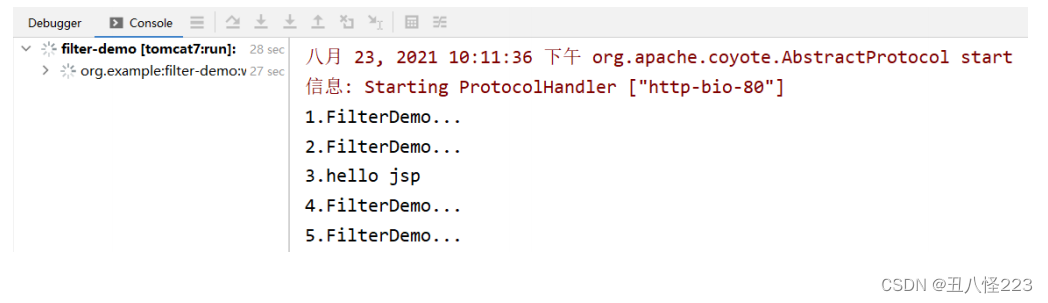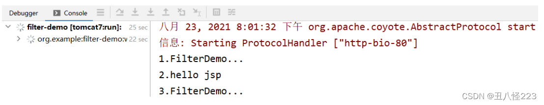 上述效果说明 FilterDemo 这个过滤器的 doFilter() 方法执行了,但是为什么在浏览器上看不到 hello.jsp 页面的内容 呢?这是因为在 doFilter() 方法中添加放行的方法才能访问到 hello.jsp 页面。那就在 doFilter() 方法中添加放行的