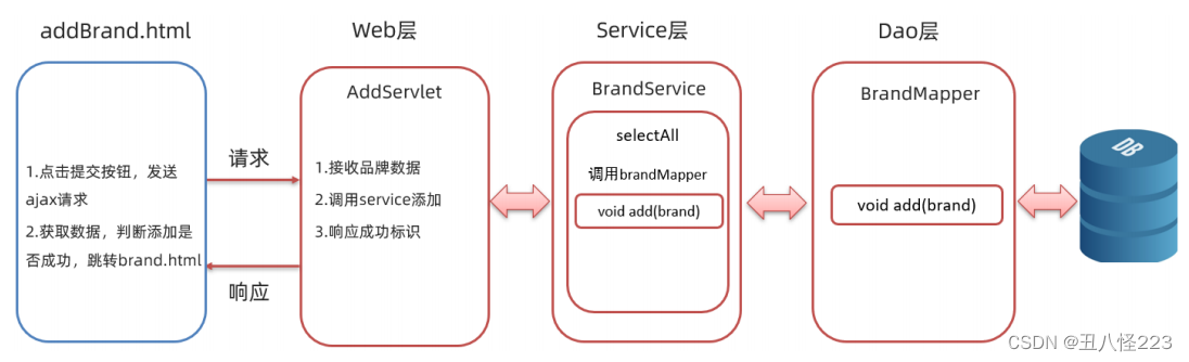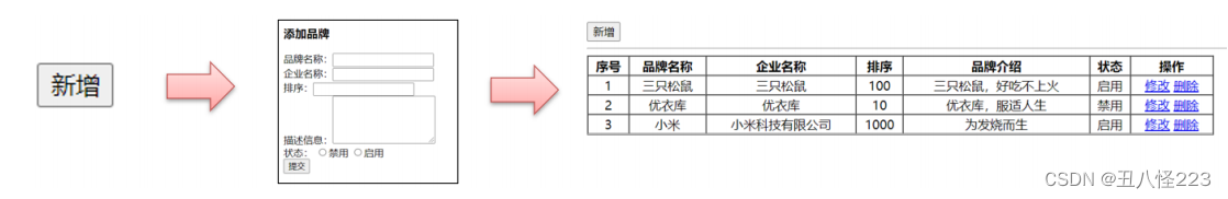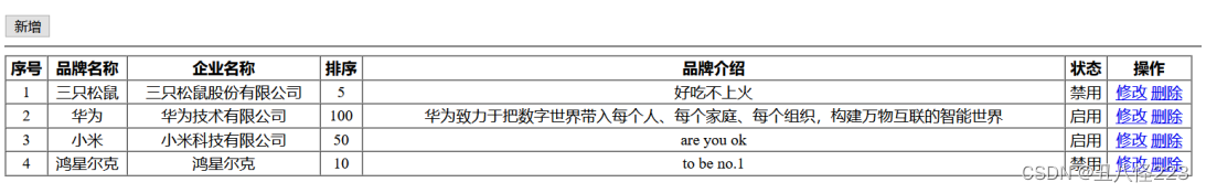 如上所示,当我们点击 新增 按钮,会跳转到 addBrand.html 页面。在 addBrand.html 页面输入数据后点击 提交 按钮, 就会将数据提交到后端,而后端将数据保存到数据库中。