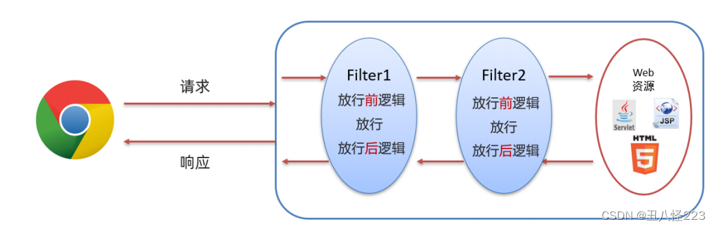 以后我们可以将对请求进行处理的代码放在放行之前进行处理,而如果请求完资源后还要对响应的数据进行处理时可以在放 行后进行逻辑处理。
