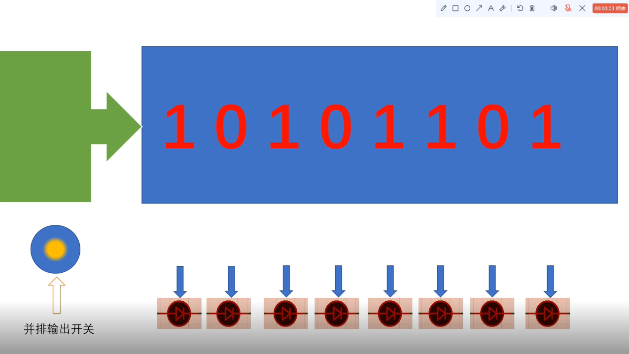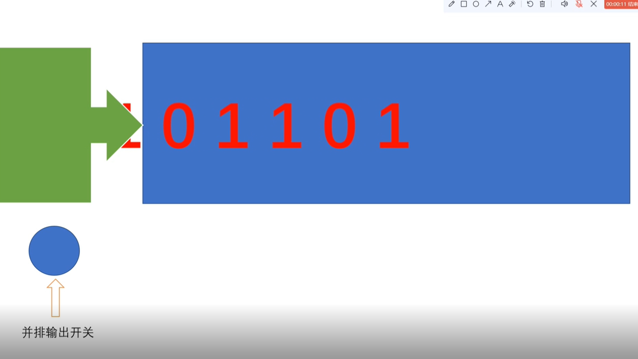 最后这个并排输出又啥?看上面的视频,当“并排输出开关”被触发时,74HC595移位寄存器里面存储的数字就会被输出出来,它不是一个一个的出来的,而是并排同时出来,称为“并排输出”