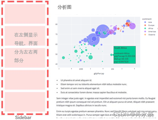 Streamlit框架提供几种界面布局模板,在这里使用常用的左右单页面结构,如下图所示左侧为Sidebar,对应的API表示为: