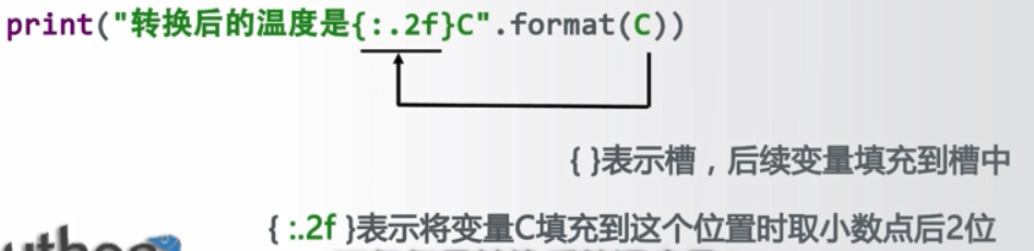 print("转换后的温度是{:.2f}C".format(c))(向控制台打印输出,此处输出:转换后的温度是(一个数字)C)