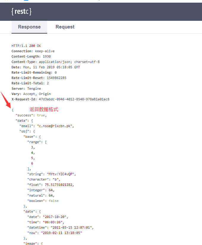 上面只展示了最基本的语法,如果你不明白为何要这样定义?请阅读 Mock.js 文档。 下面是生成的随机数据,会随请求发生改变。