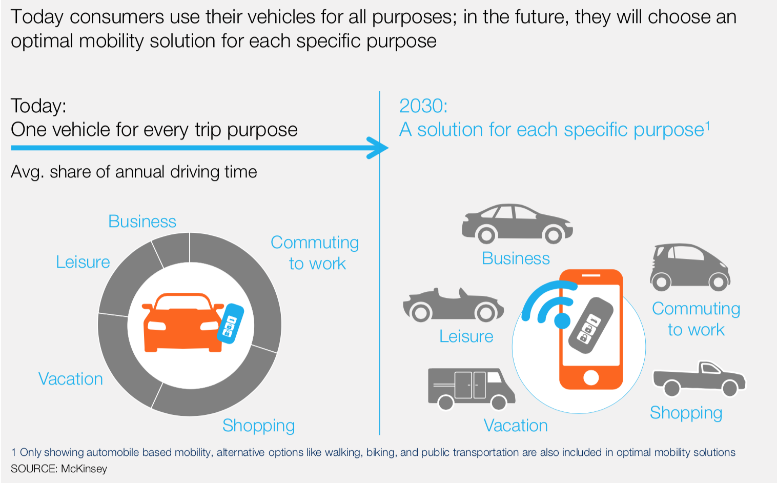 再者,从远期来看,消费者的需求是共享以及进一步的功能细分,更强调个性体验。以下分析来自麦肯锡在16年发布的报告Auto 2030 Report。