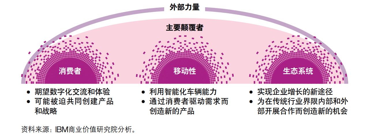 报告中还定义了汽车行业面对的三个主要的外部颠覆者: