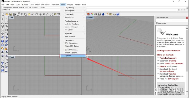 11. 双击桌面图标打开Rhino文件,在菜单栏选择Tools内的Options选项,单击。