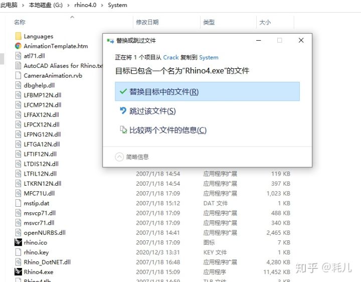 复制的是破解文件夹Crack中的Rhino4.exe、被粘贴替换掉的是软件安装目录内的exe启动文件。