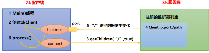 - 在Zookeeper的注册监听列表中将注册的监听事件添加到列表中,表示这个服务器中的/path,即根目录这个路径被客户端监听了