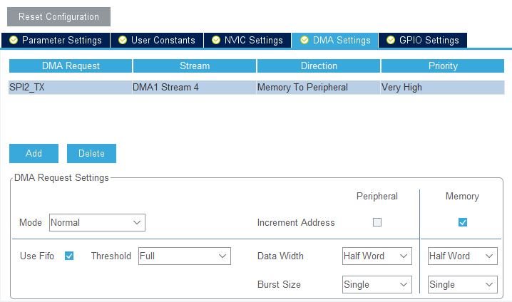 2、I2S 飞利浦协议,16bit数据帧,音频48KHz。配置DMA普通模式,数据宽度半个字节,使用满FIFO缓存单次传输,这样AHB总线给予DMA数据的优先最高,相对也会占用AHB总线。