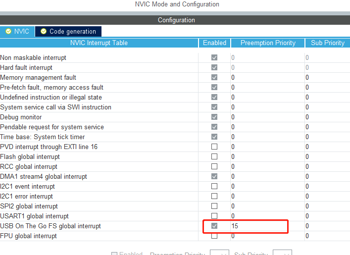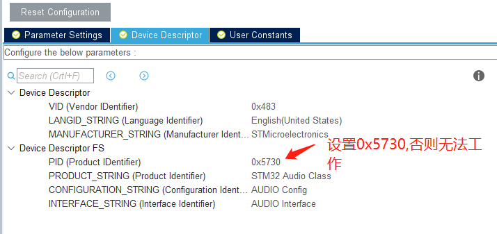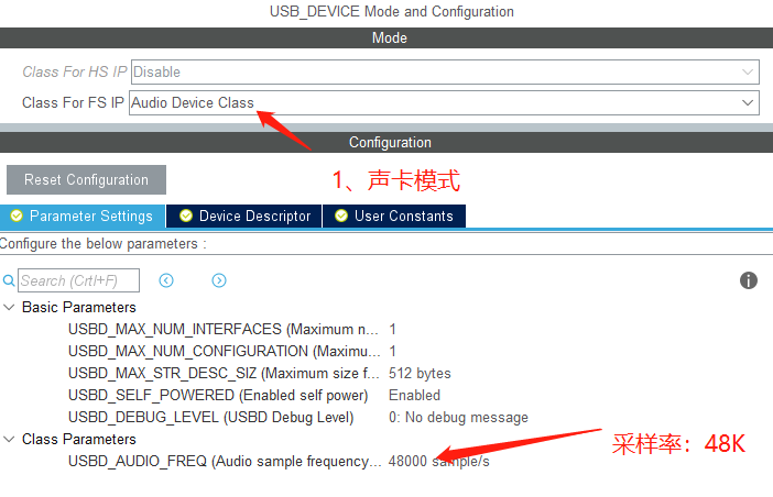 4、USB设备,选择为声卡模式,音频采样频率设置48KHz,PID设为0x5730。USB的中断优先级必须降到比0低。