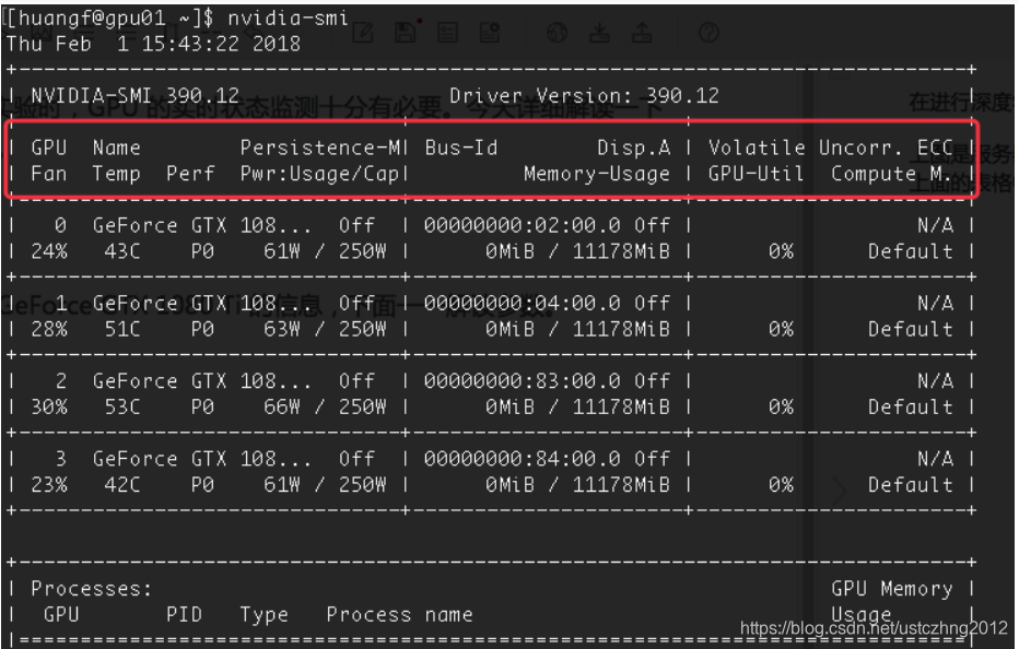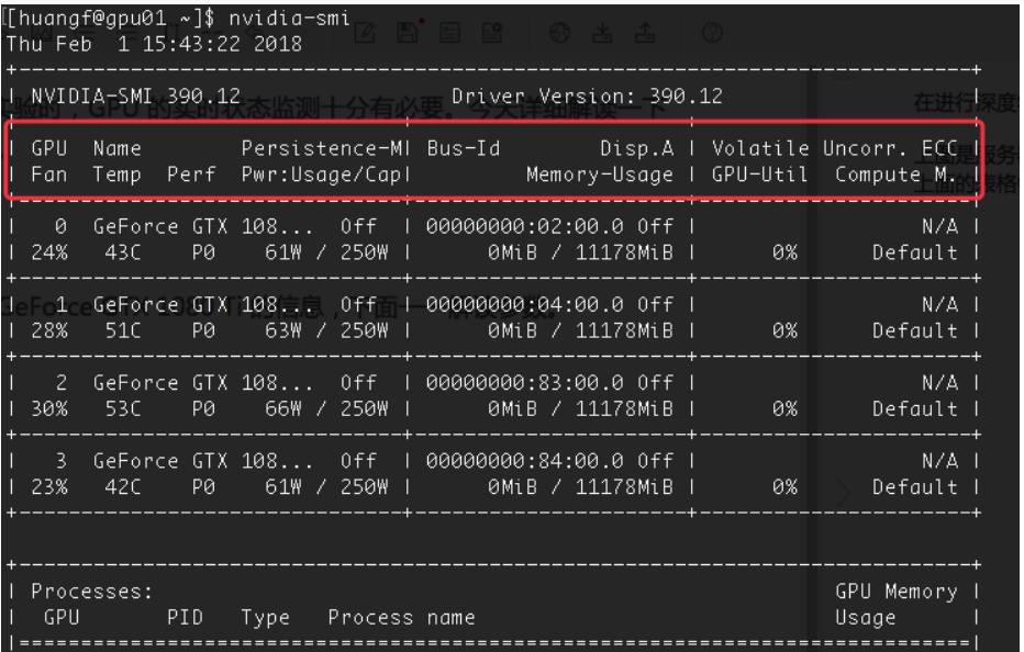 | Perf | 性能状态,从P0到P12,P0表示最大性能,P12表示状态最小性能(即 GPU 未工作时为P0,达到最大工作限度时为P12) |