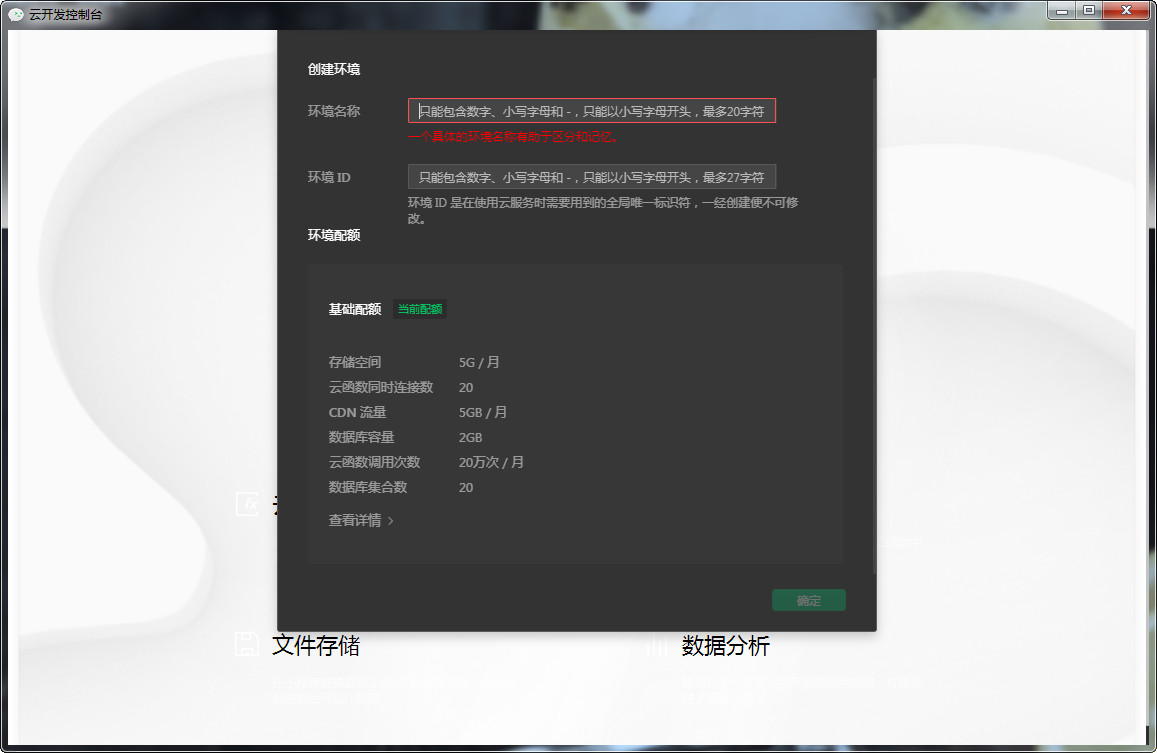 按钮,如果没有开通过会弹出下面的页面,点击开通,然后需要新建一个云环境,根据就说明一步步认真填写,因为一个小程序号最多可以创建两个环境,并且销毁环境很麻烦,需要通过官方那边,环境版本先用基础版就好了。