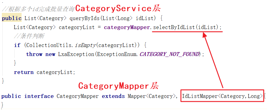 这个就比较复杂了,依次获取多级分类对应的id,使用Arrays的asList方法将其转换成集合,再调用CategoryService中的方法查询。