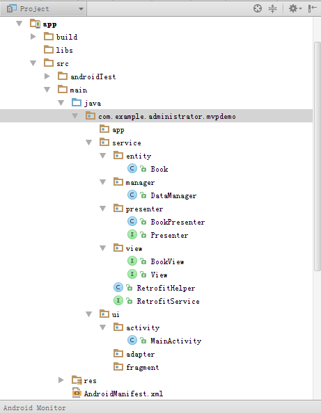 接下来我们就看看,在一个项目中上面三者是如何配合的。我们打开Android Studio,新建一个项目取名为MVPDemo。这个demo的功能也很简单,就是点击按钮调用上面的那个测试接口,将请求下来书的信息显示在屏幕上。首先我们来看一下这个工程的目录结构: