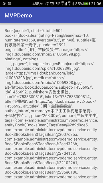 onFailure方法,也就是请求成功和失败的回调方法。当成功时,它会返回Response,里边封装了请求结果的所有信息,包括报头,返回码,还有主体等。比如调用它的body()方法就可获得Book对象,也就是我们需要的数据。这里我们就把返回的Book,显示屏幕上。如下图: