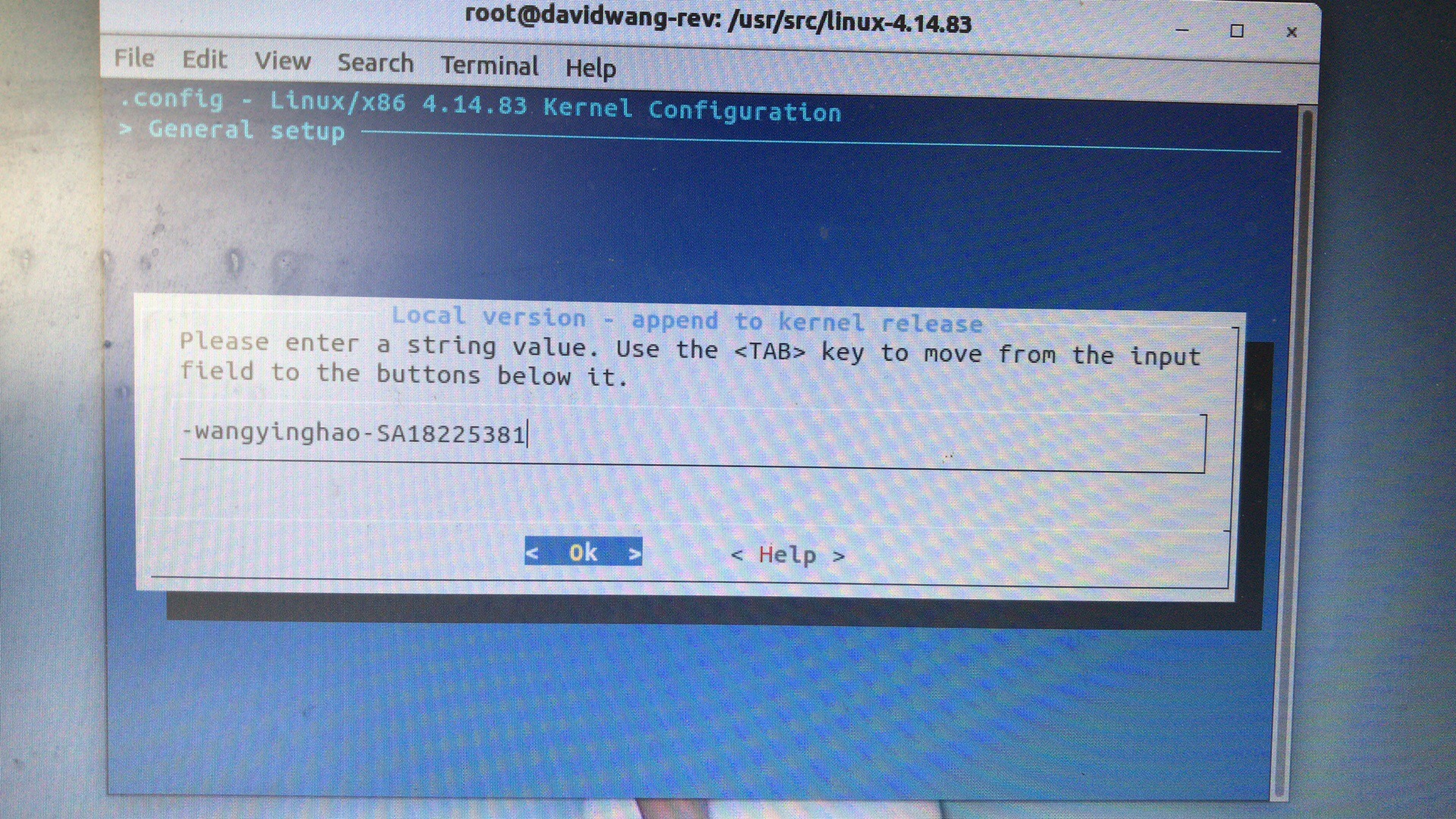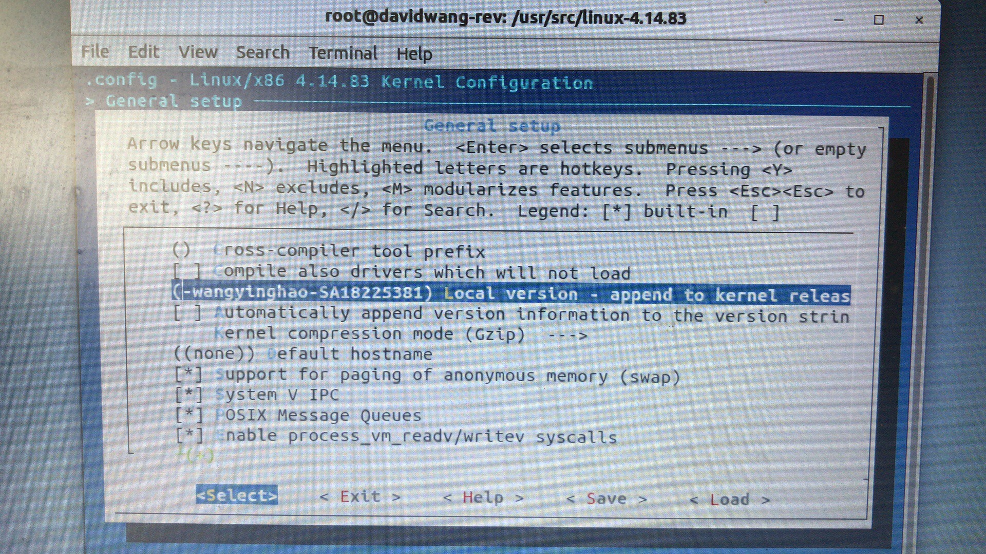 选择General setupàLocal version – append to kernel release添加个人信息-wangyinghao-SA18225381