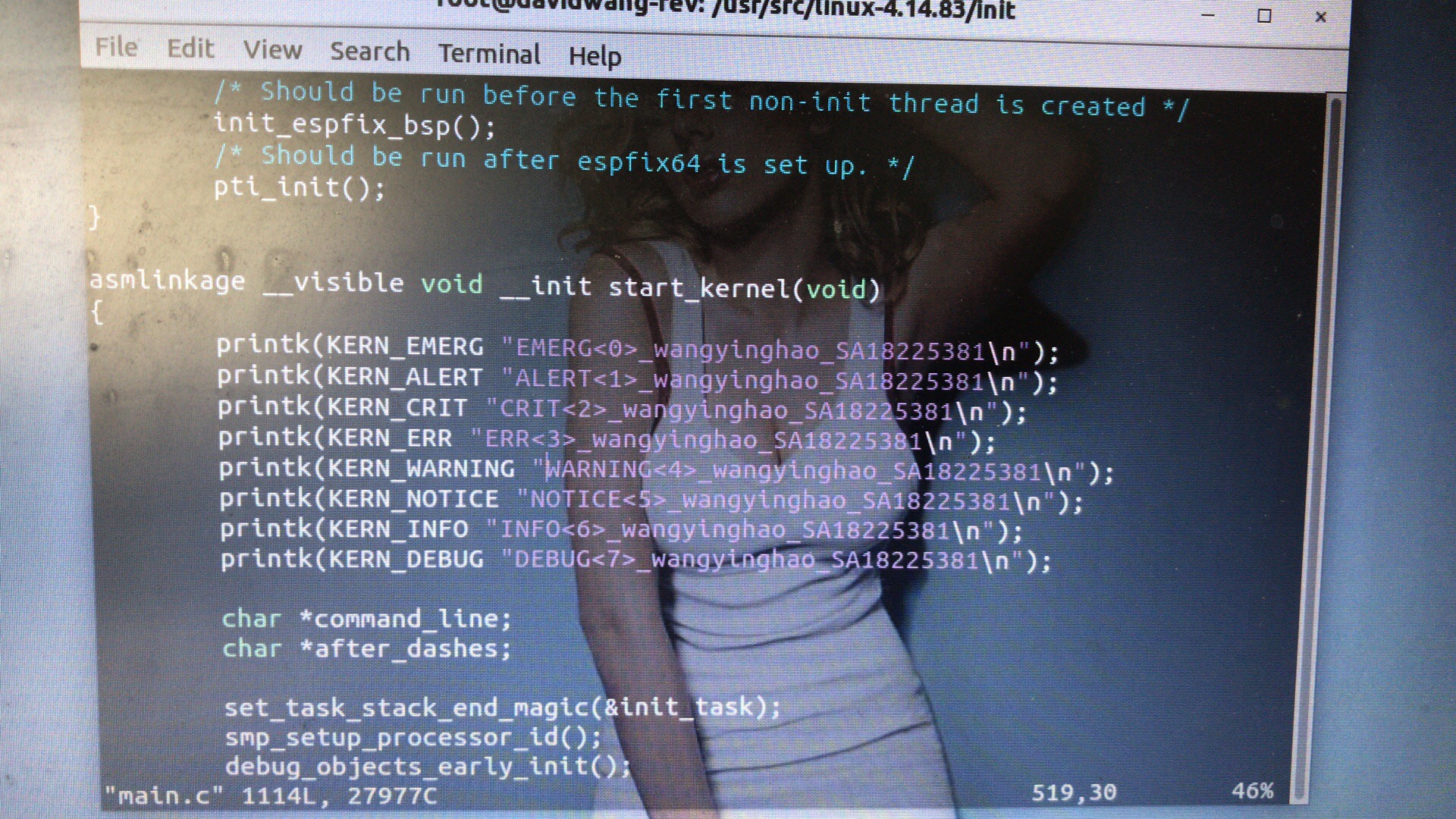 vim main.c 在start_kernel 513行添加printk(KERN_DEBUG "------");(打印个人信息)