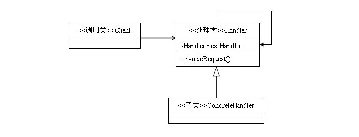 主要包含一个指向下一处理类的成员变量nextHandler和一个处理请求的方法handRequest,handRequest方法的主要思想是,如果满足处理的条件,则本处理类来进行处理,否则由nextHandler来处理。