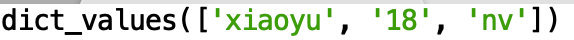 d = dict(name = 'xiaoyu',age = '18',gender = 'nv')print (d.values())
