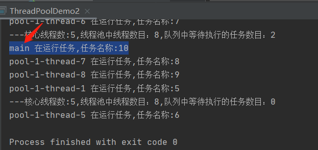 核心线程数(1,2,3,4,5满)->缓存队列数(放2个任务满(任务名称5和6))->最大线程数(6,7,8满)->由主线程执行任务名称10.