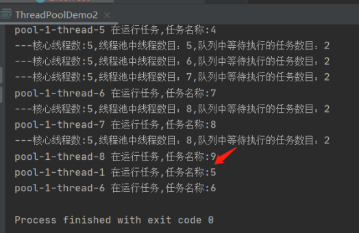 ---核心线程数:5,线程池中线程数目:8,队列中等待执行的任务数目:2