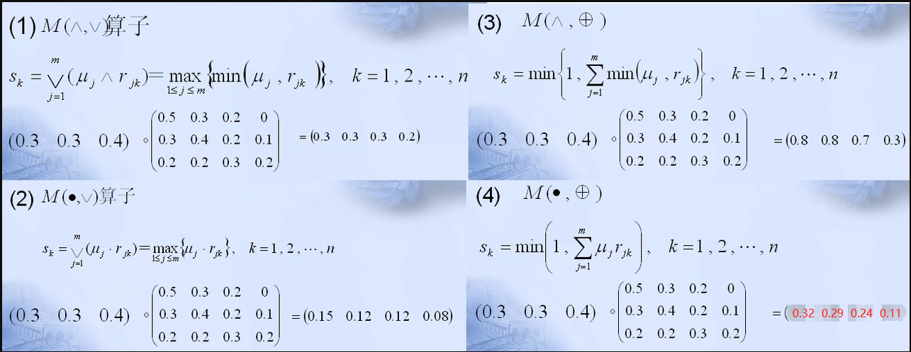 然后算子中,∧表示取小,∨表示取大,· 表示相乘,圆圈中一个加号表示求和。