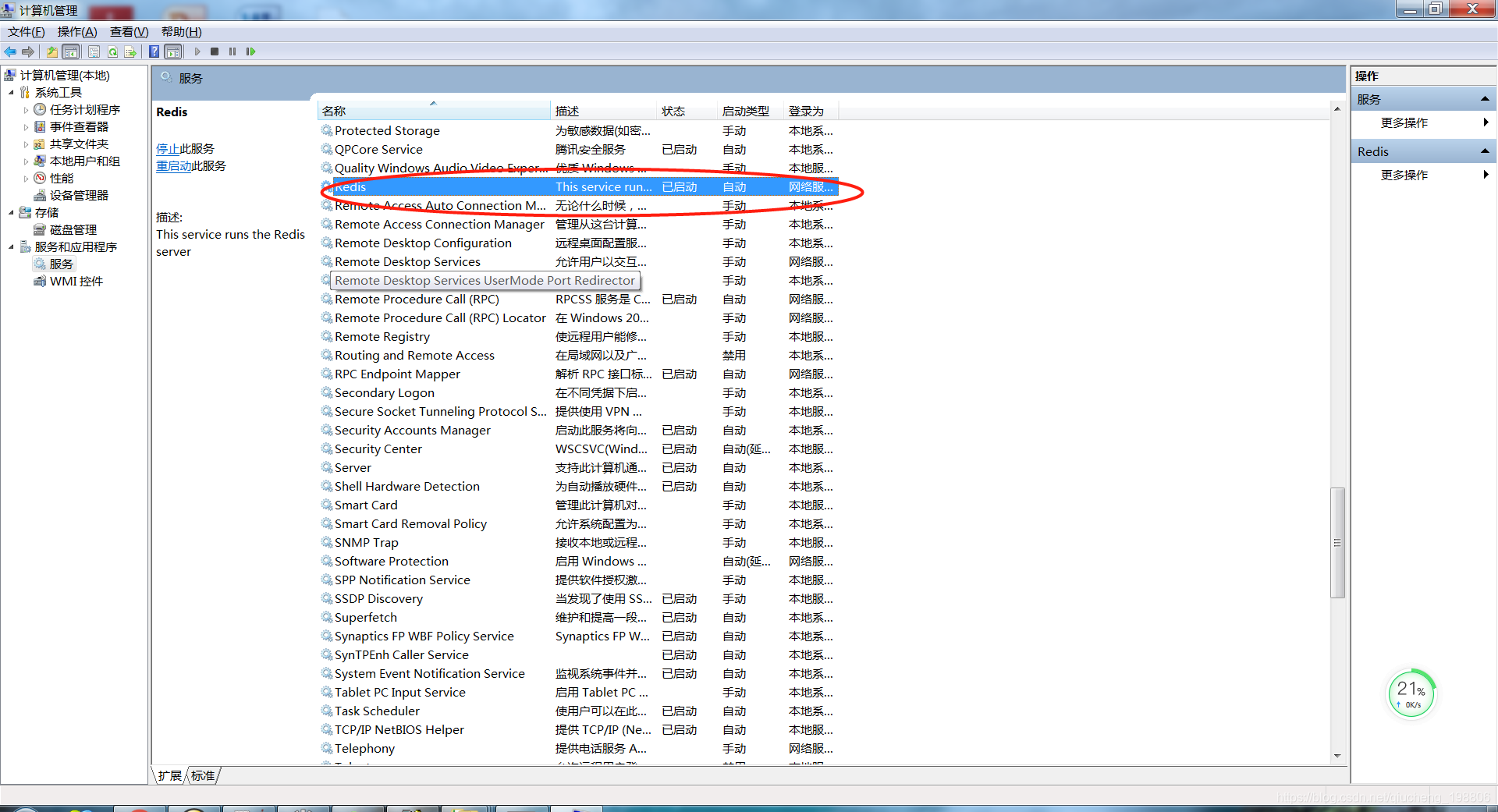 11.点击“开始”按钮,右键“计算机”,点击“管理”,打开服务并查看redis服务是否已启动