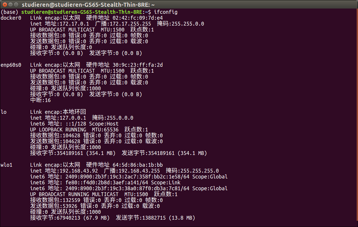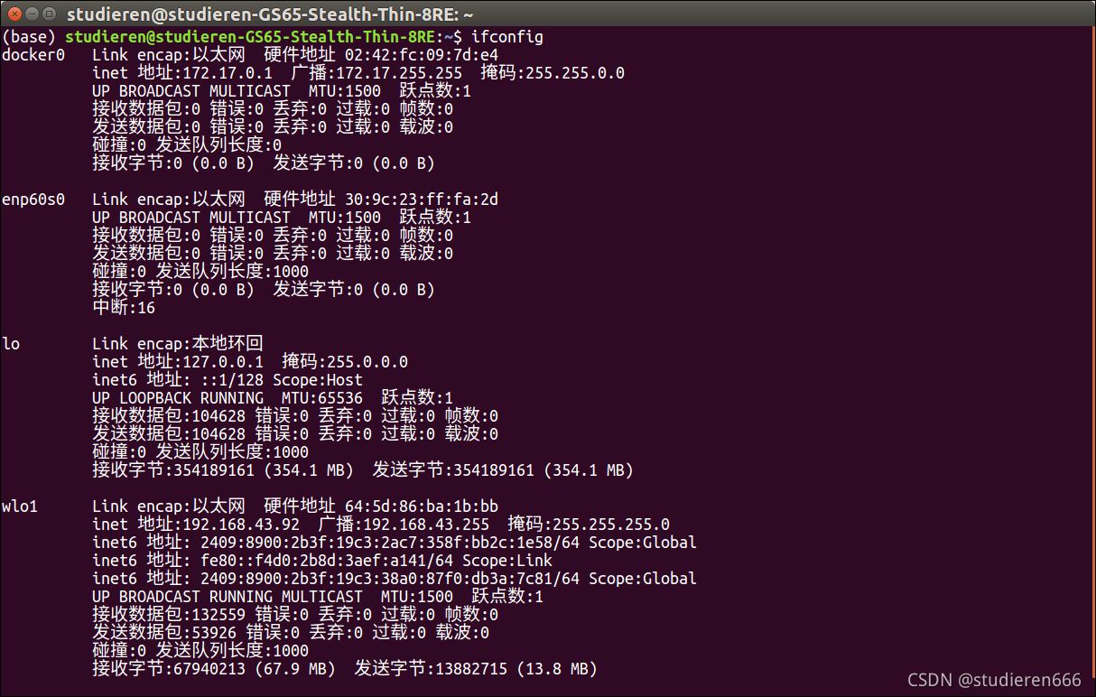 ifconfig主机IP为192.168.43.92, 从机IP为192.168.43.121