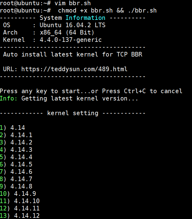 wget --no-check-certificate https://github.com/teddysun/across/raw/master/bbr.sh && chmod +x bbr.sh && ./bbr.sh会列出可供更新的版本,我选择最新的 5.4.13