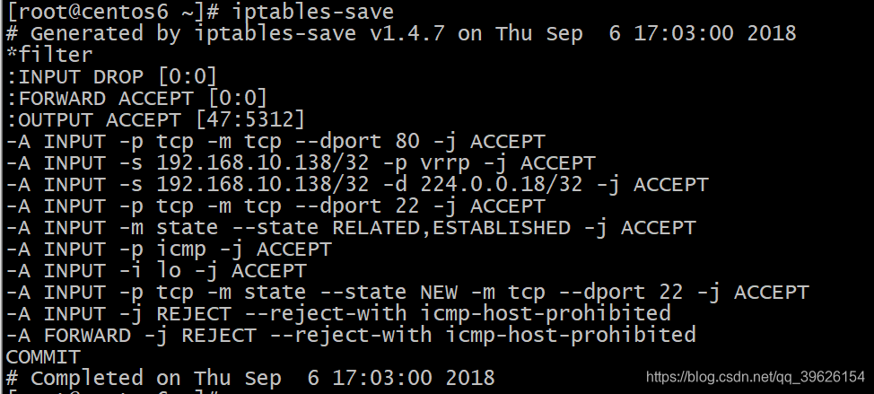 # iptables -I INPUT -s 192.168.10.138/24 -p vrrp -j ACCEPT #允许VRRP(虚拟路由器冗余协)通信