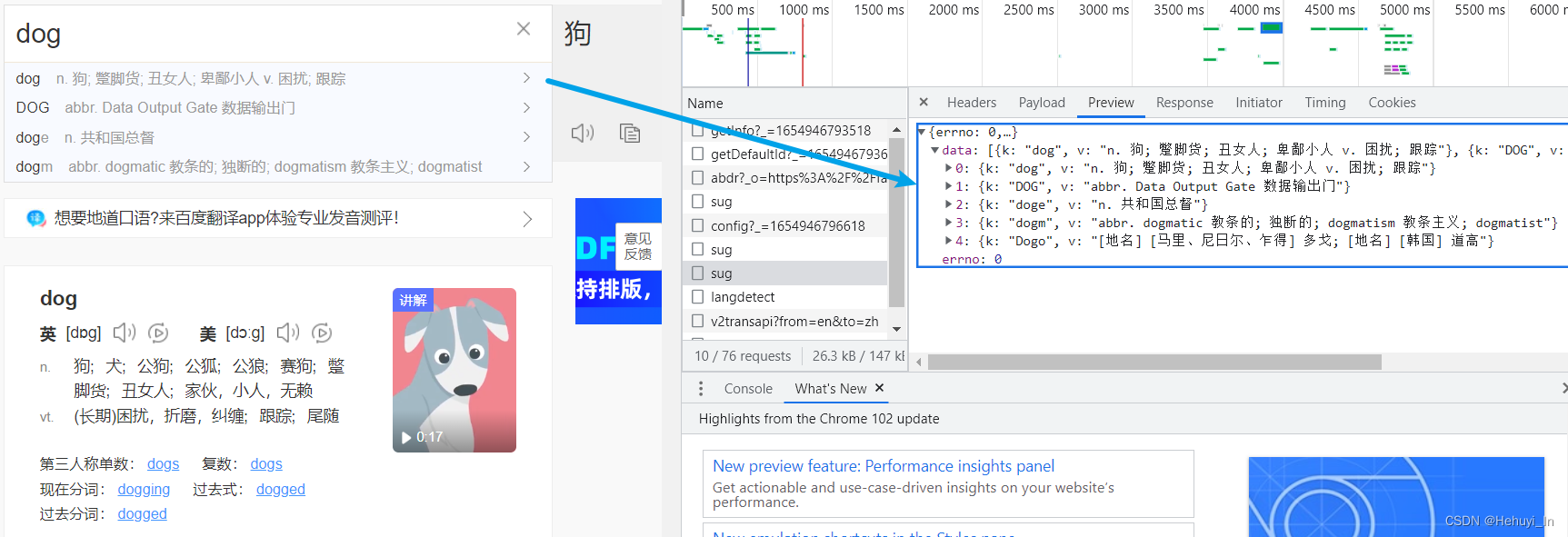 其实这就是前面提到的客户端渲染的网页。它的源码中只有一个框架,数据是在第二次请求的时候传入的(输入dog,才新传入sug中的数据)。