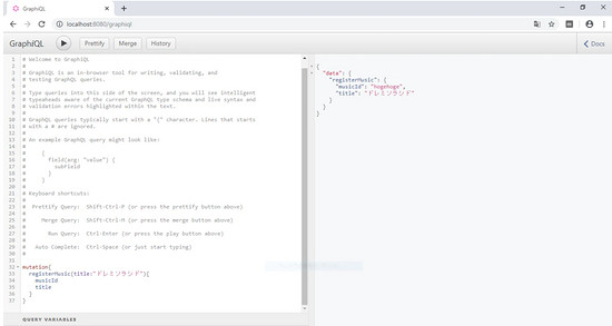 $ curl -s "http://localhost:8080/graphql" -X POST -H "Content-Type: application/json" -d '{"query":"mutation{registerMusic(title:\"NO WAR in the future\"){musicId,title}}"}'