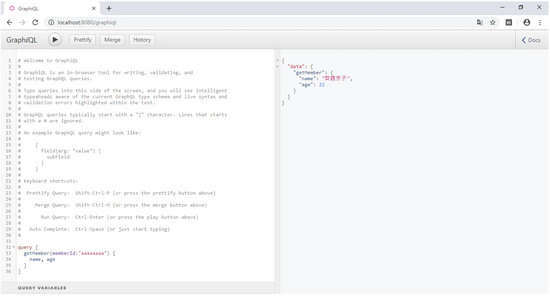$ curl -s "http://localhost:8080/graphql?query=query%7BgetMember(memberId:%22bbbbbbbb%22)%7Bname,age%7D%7D"