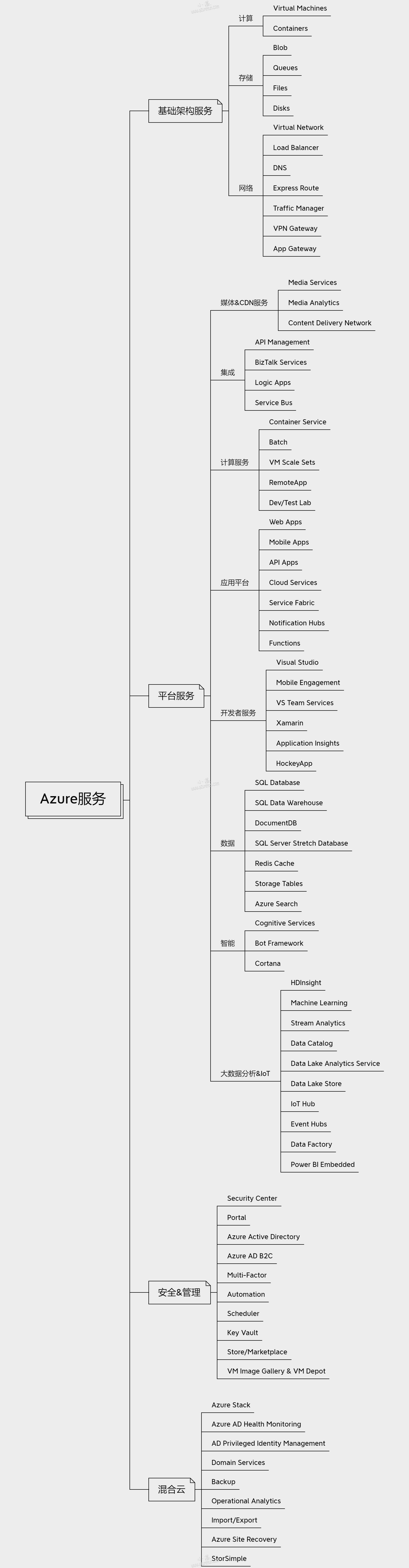 Azure提供超过100种服务,可以用于最为直接的虚拟机替代物理主机运行现有应用,如下是Azure支持的服务及相应的服务展示图供大家查阅: