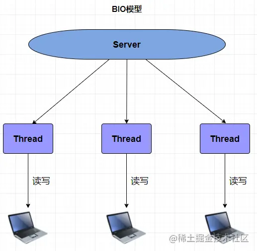 通过上面我写的代码案例和这张表格,相信大家对与同步及阻塞有了很清晰的认识了。下面我们一起看看 BIO 的模型图: