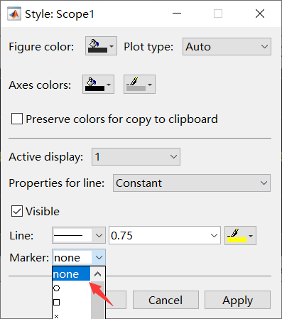 6.对于scope模块的线条呈现标记符号如“o"的问题,simulink scope中的markers enabel to highlight data