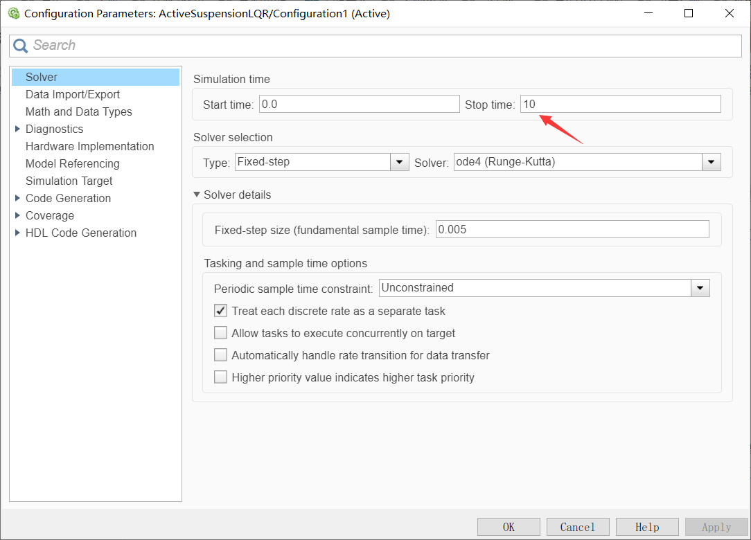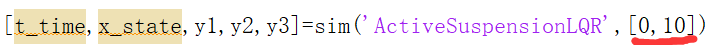 ②对于matlab中设定的仿真分析时间要与simulink设定的仿真时间相同,如下matlab的sim函数中设定仿真时间为10s,所以simulink中也要设定为10: