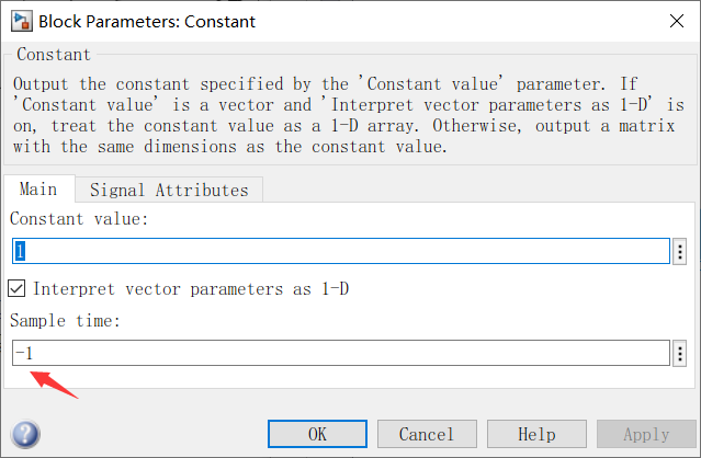 补充:对于constant模块输出实际上是一条线,但是由于默认采样时间是inf,所以导致只有一个点,只需将采样时间设置为:-1,即继承采样时间的意思。如下: