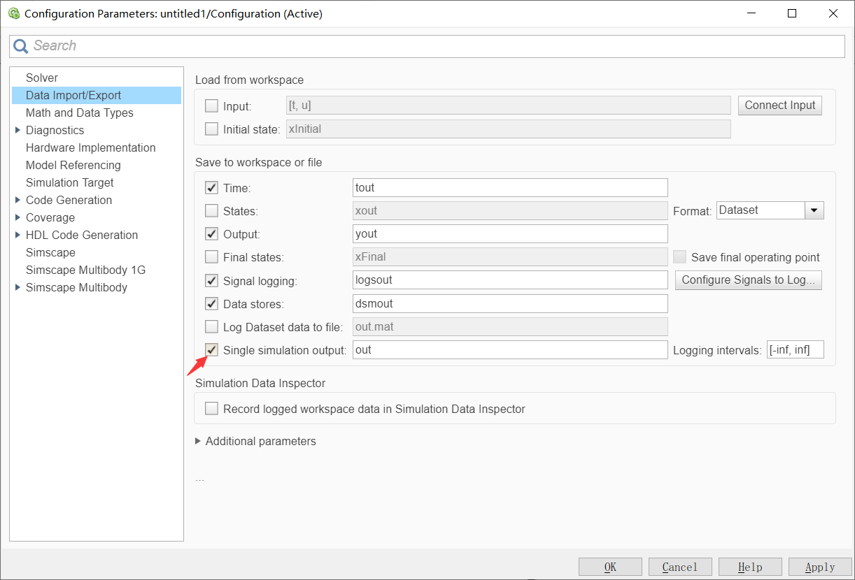 [T,X,Y1,...,Yn] =sim('model',Timespan, Options, UT)其中T为时间变量,X为状态,Y1....Yn为使用out等模块输出到工作区间的值,以out模块输出为例,其Y1对应out模块参数中Port number :1,以此类推。