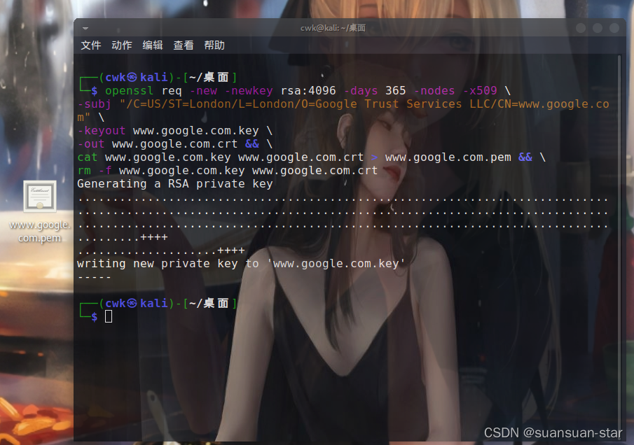 rm -f www.google.com.key www.google.com.crtCN=(名字与姓氏), OU=(组织单位名称), O=(组织名称), L=(城市或区域名称), ST=(州或省份名称), C=(单位的两字母国家代码