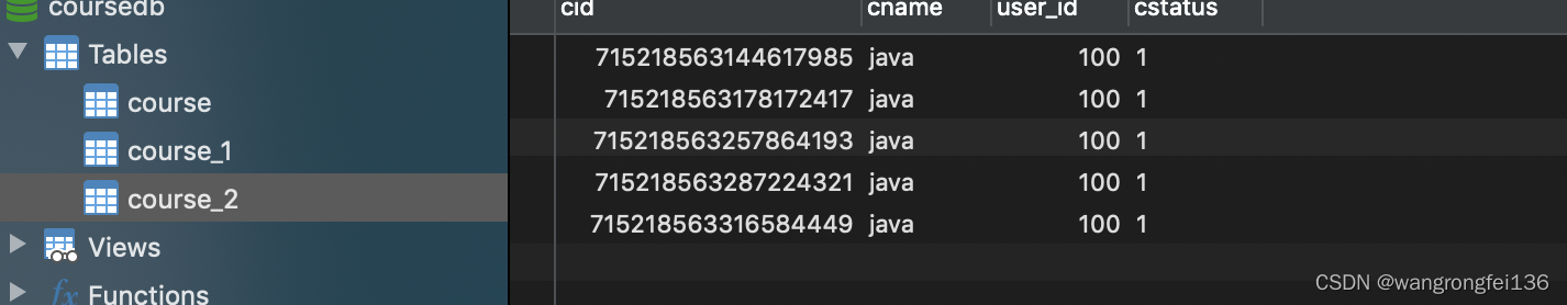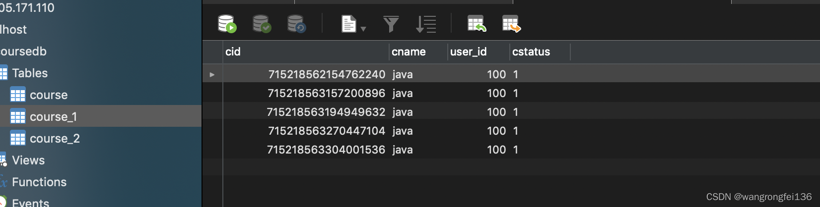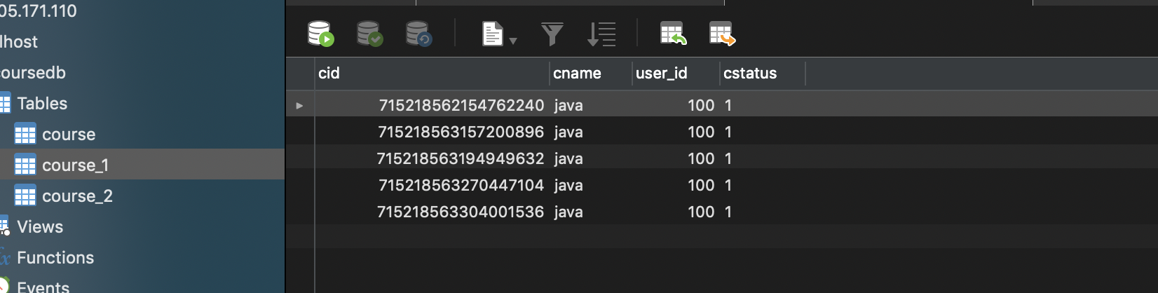 分析实际执行SQL得到:Actual SQL: m1 ::: INSERT INTO course_1 ( cid,cname,user_id,cstatus ) VALUES (?, ?, ?, ?) ::: [0, java, 100, 1]