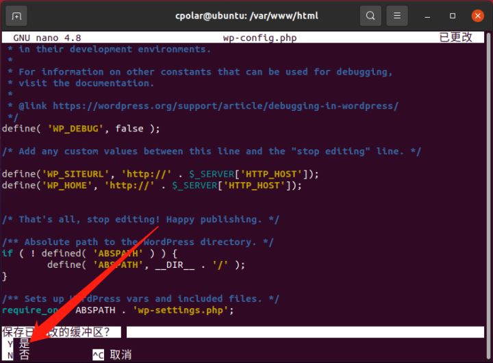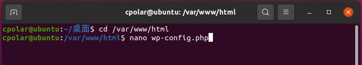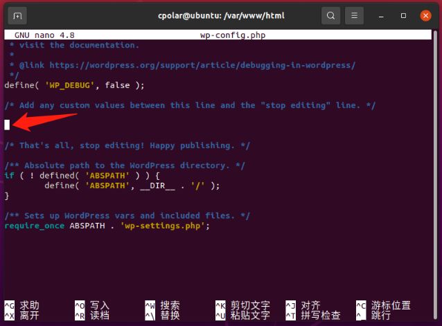 接着,我们要对WordPress本身的设置文件进行修改,让公共互联网的连接请求能被WordPress正确处理。首先进入WordPress文件存放的html目录(在命令行界面输入命令/var/www/html),找到WordPress的配置文件wp-config.php进行编辑,即输入命令nano wp-config.php